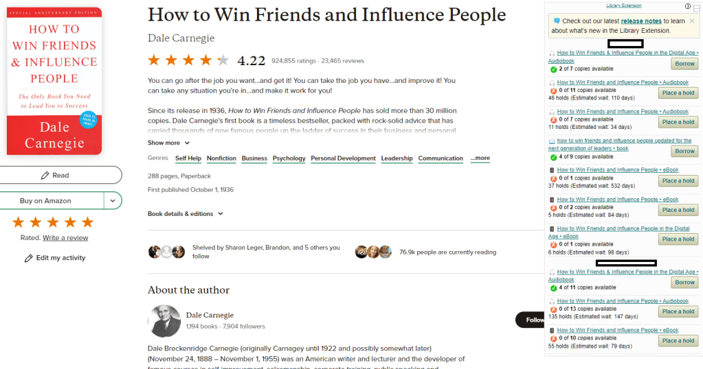 The “Library Extension” browser extension came to the rescue. This allows you to add in your library catalog (~5,000 currently supported) and will start searching for the books displayed on common book webpages (goodreads, amazon, etc.). You can see the extension results on the right hand side of the screen, along with the formats available as well as expected wait time.